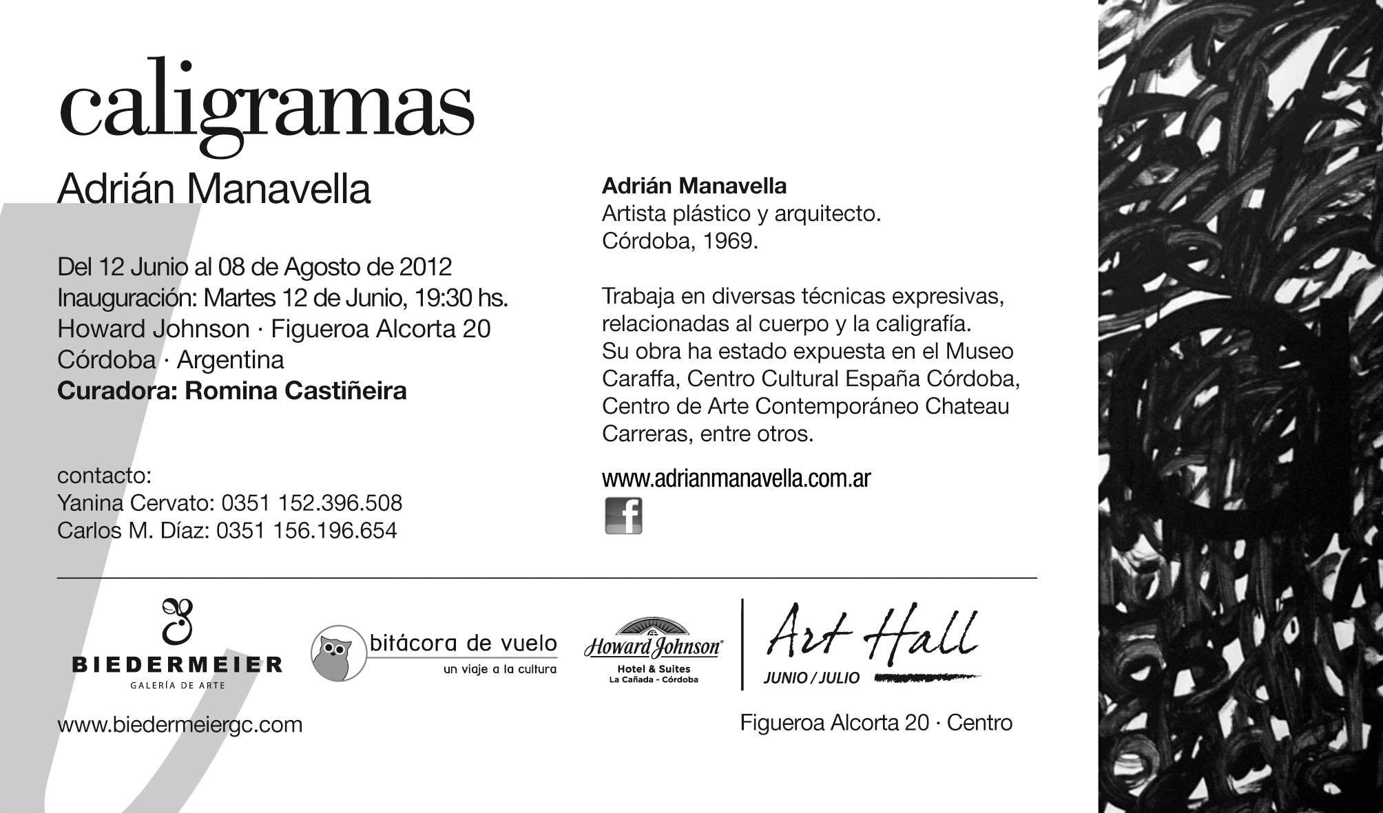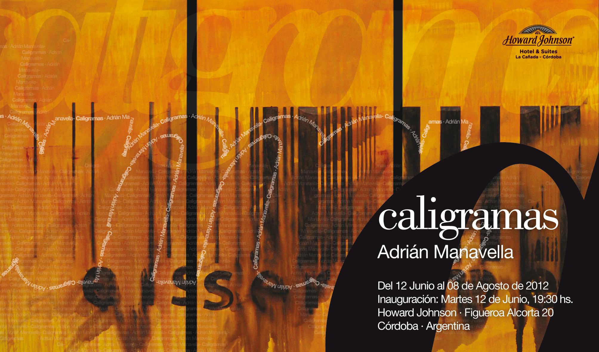 junio 12, 2012diciembre 21, 2022 CALIGRAMAS · Howard Johnson Art Hall Hasta el 08 de Agosto de 2012 puede visitarse la exposición Caligramas en el Howard Johnson -Figueroa Alcorta 20, Córdoba. Comparte esto: Compartir en WhatsApp (Se abre en una ventana nueva) WhatsApp Compartir en Facebook (Se abre en una ventana nueva) Facebook Share on Pinterest (Se abre en una ventana nueva) Pinterest Share on LinkedIn (Se abre en una ventana nueva) LinkedIn Me gusta Cargando...