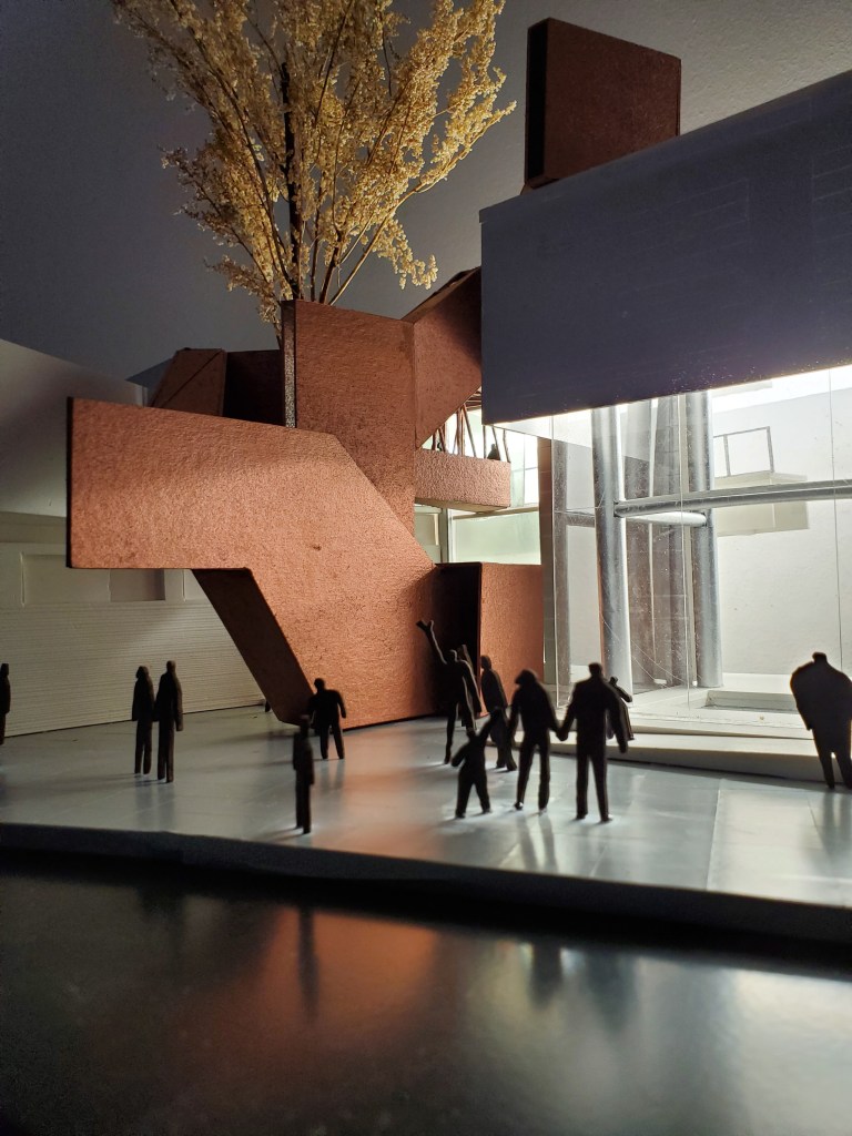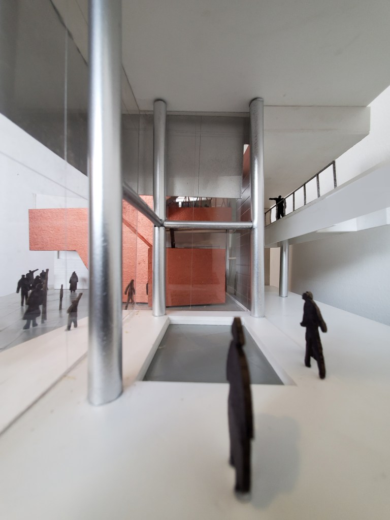El tránsito por el interior de la escultura hasta lo alto de la cubierta del museo hace posible el descubrimiento de un sinnúmero de miradas. Danza Mamba deviene en un dispositivo de observación que devela inusitadas vistas del edificio y del contexto adyacente, genera puntos de vista no previstos, fragmentos singulares de paisaje y panoramas de vastos horizontes que se abren ante nuestros ojos.