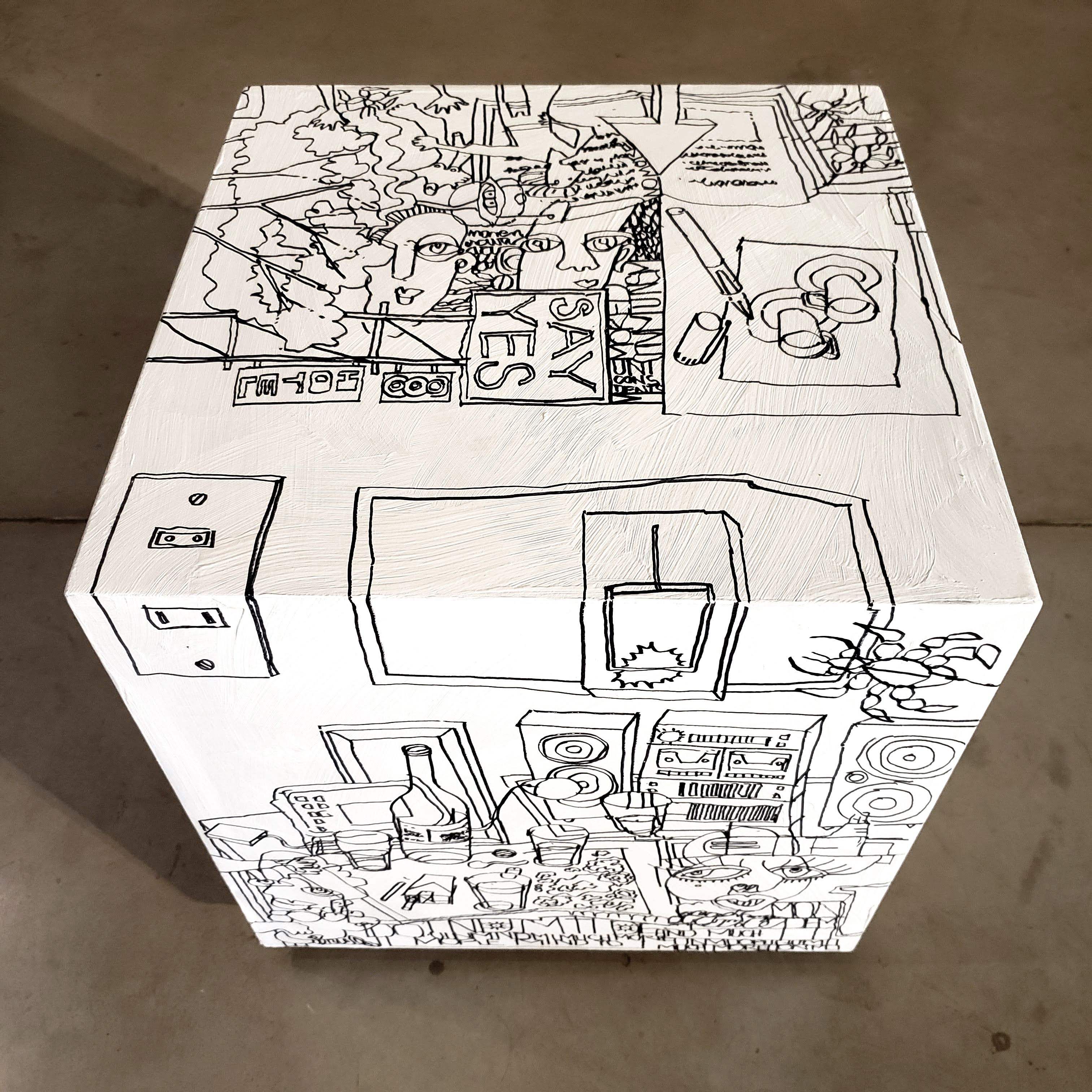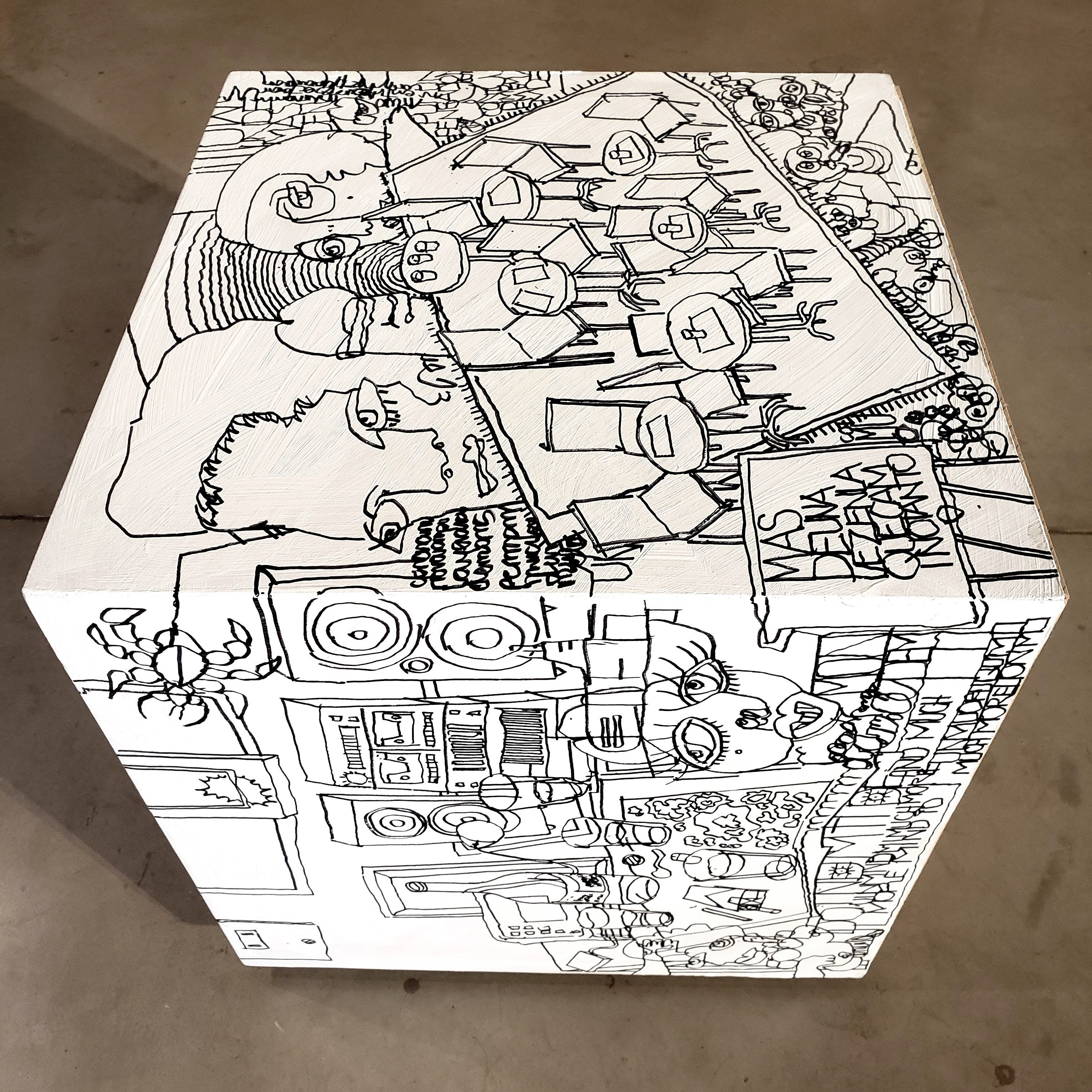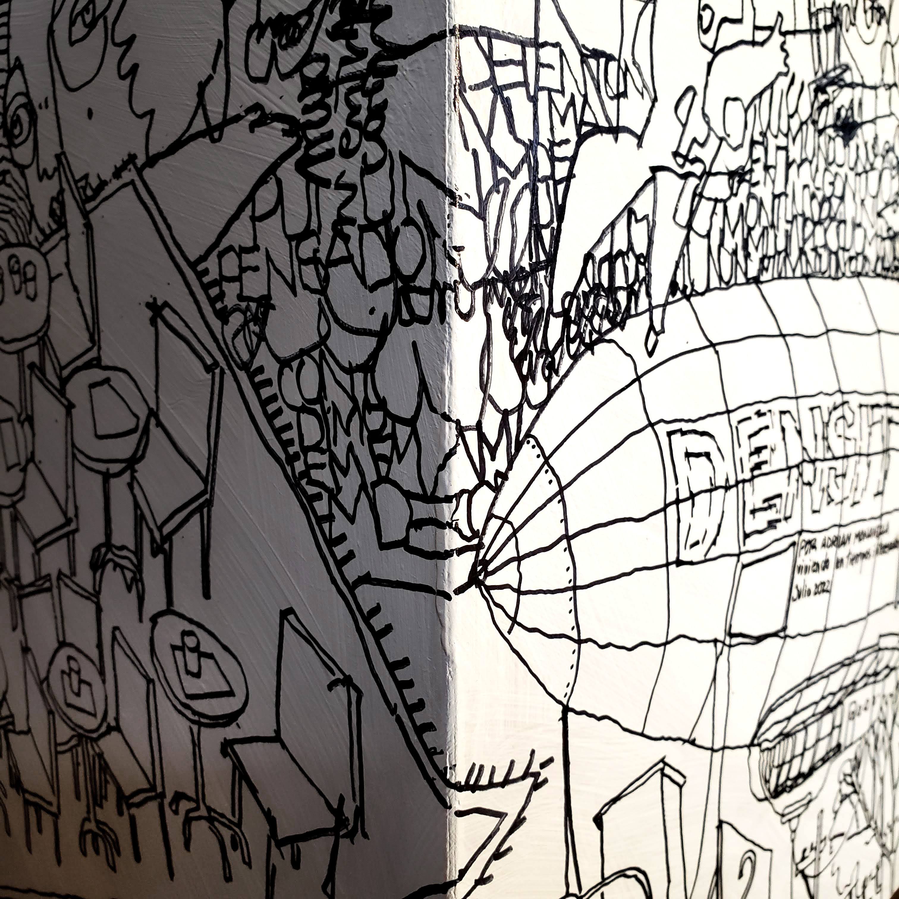 Es un volumen cúbico de madera intervenido con dibujo. Es una obra realizada para el evento solidario #bancodeartistas2022, invitado por @giuntamuebles y @bancodealimentoscba
