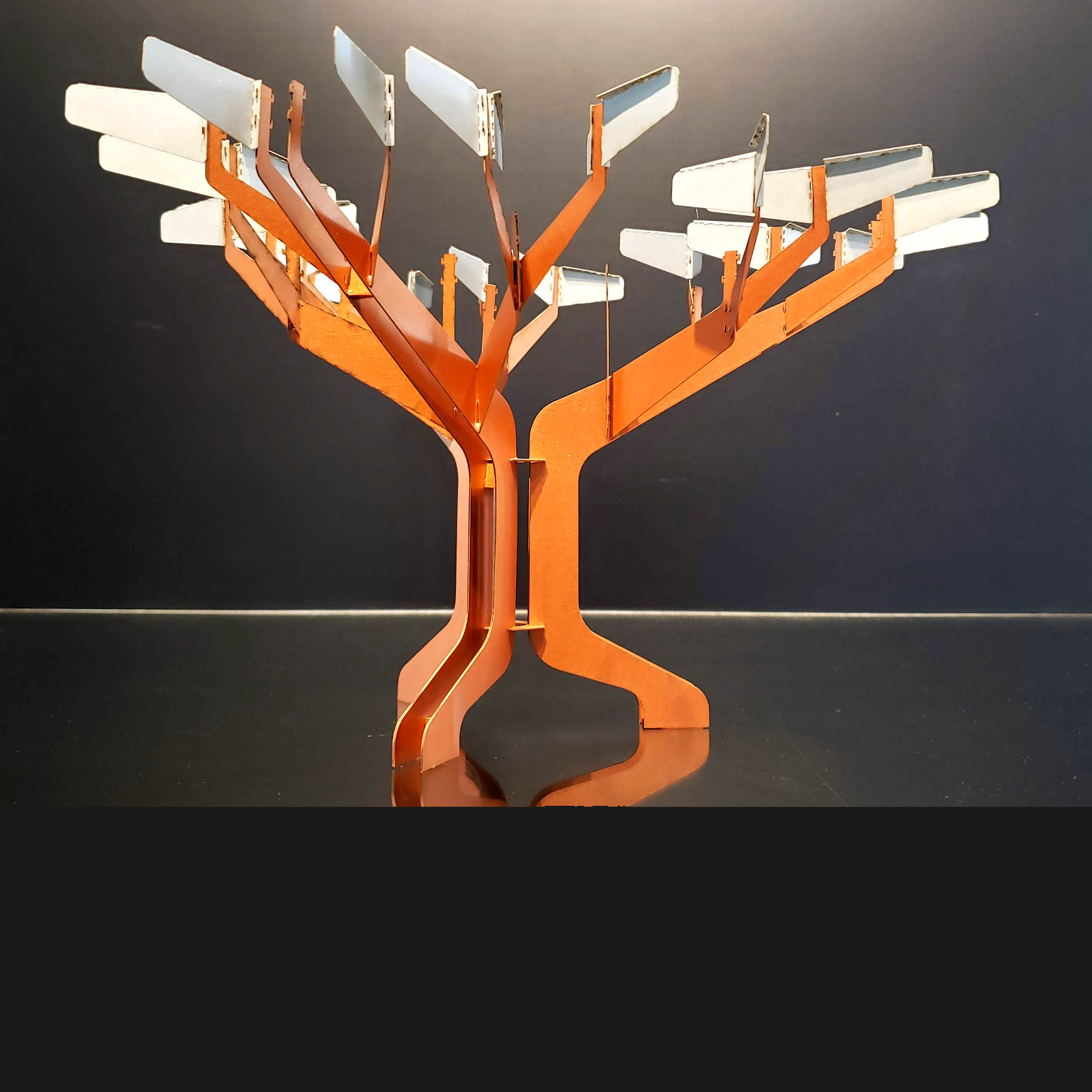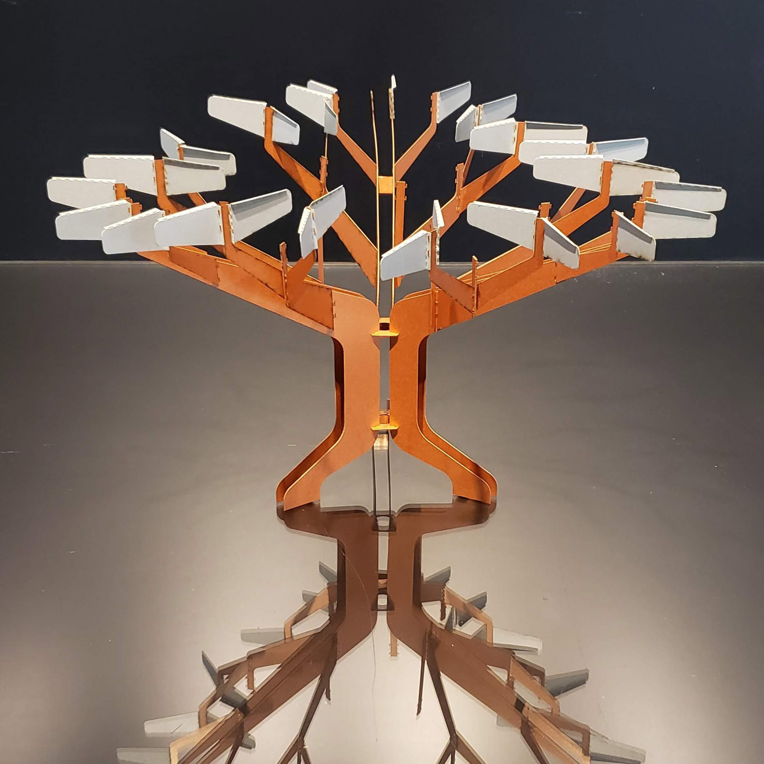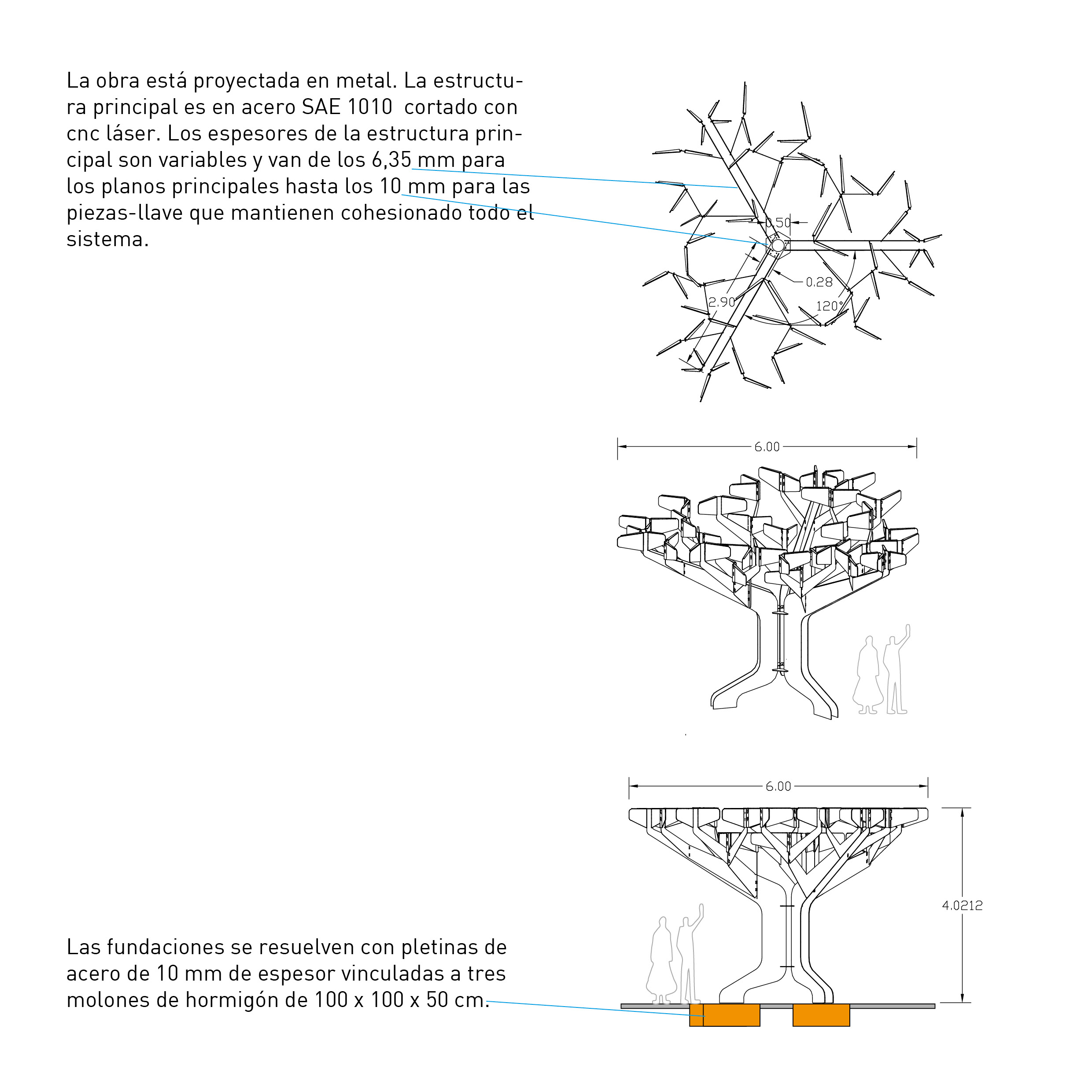 La obra está pensada como un dispositivo metálico con silueta de árbol. Opera con lógica icónica, pregnante, rápidamente comprensible. Es un mojón, un hito, una referencia en el lugar. Es un lugar de reunión, un lugar de enseñanza y aprendizaje, un aula.