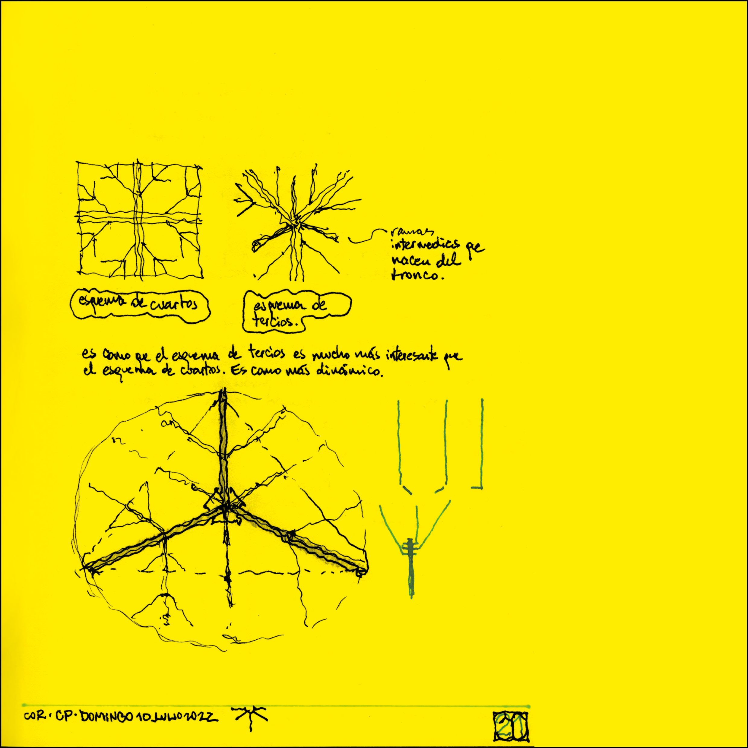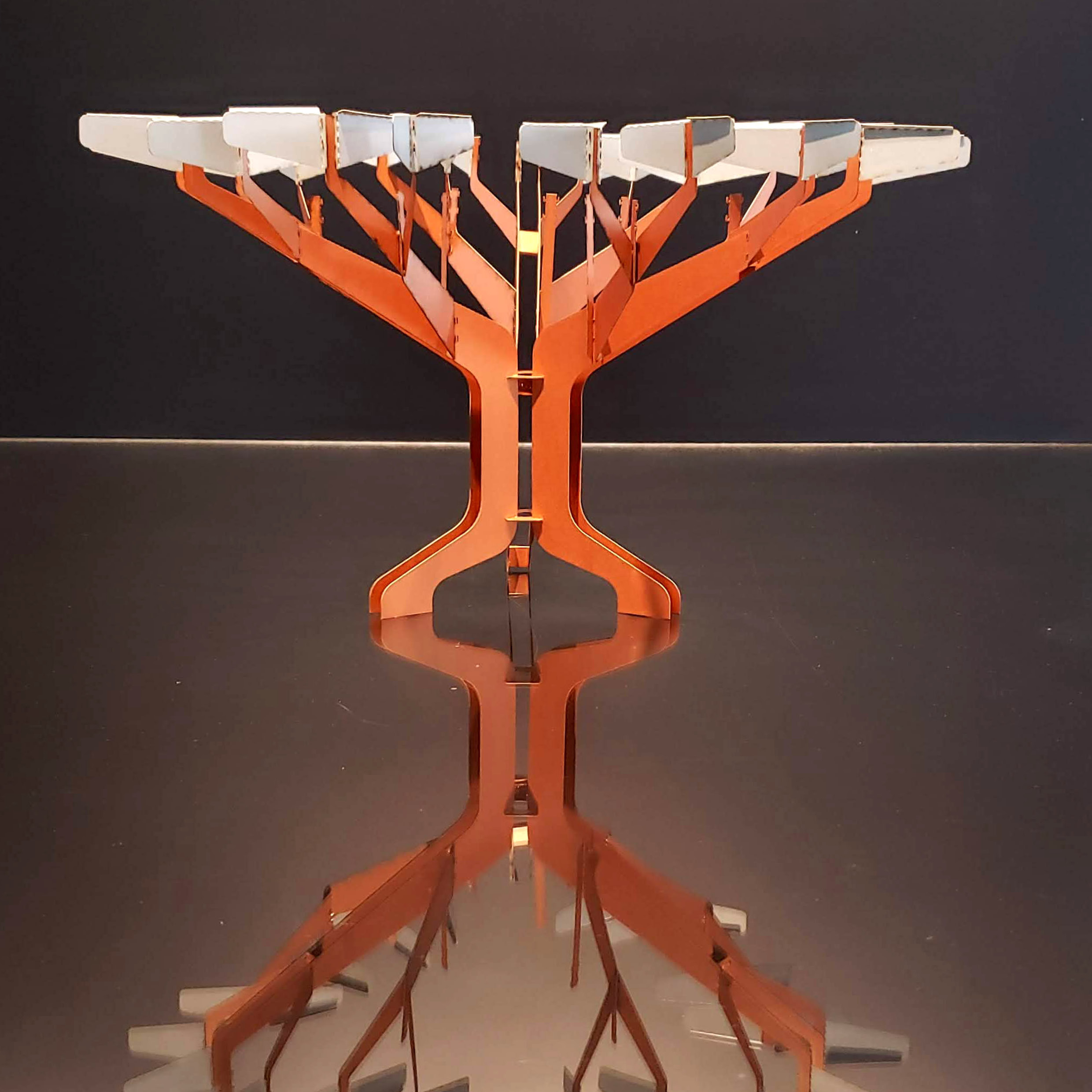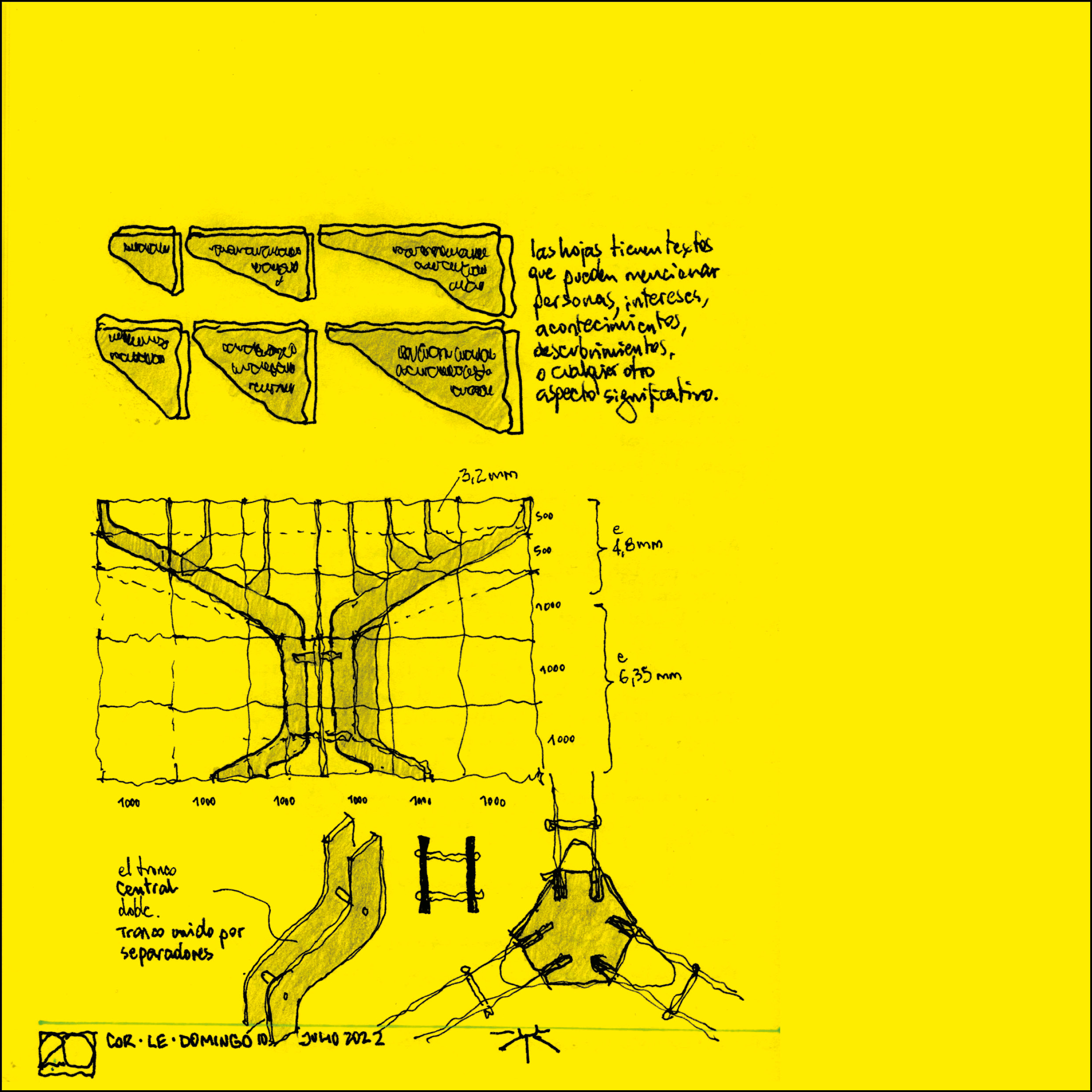 La obra está pensada como un dispositivo metálico con silueta de árbol. Opera con lógica icónica, pregnante, rápidamente comprensible. Es un mojón, un hito, una referencia en el lugar. Es un lugar de reunión, un lugar de enseñanza y aprendizaje, un aula.
